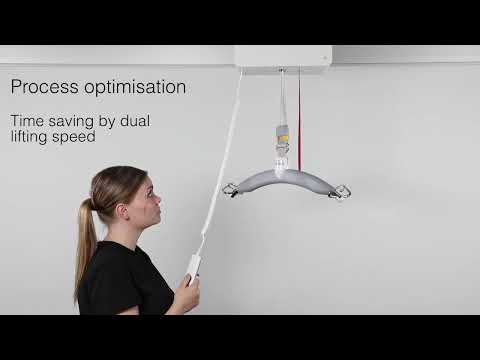 One of the GH3’s standout features is its automatic self-charging system: the module charges through the rails regardless of its position in the system, ensuring the ceiling hoist is always ready for use. It can also be fitted with a built-in motor for horizontal movement along the traverse rail, operated via a hand control unit or an infrared (IR) remote control.